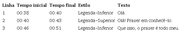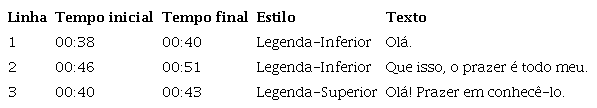 Estabelecemos, também, um outro critério para definir a ordem em que as linhas de legendas aparecem nos arquivos. Percebemos que o padrão do software é organizar as linhas de legendas conforme elas são criadas, como é exemplificado na Tabela 5. Contudo, preferimos organizá-las pela ordem alfabética do nome dos estilos estabelecidos pelos fansubbers, conforme a Tabela 4.