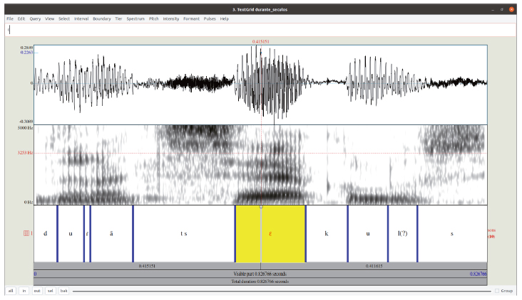 Para extrair a duração de uma vogal (ou de qualquer outro segmento) é necessário primeiro selecionar o intervalo de tempo dentro do qual a vogal ocorre fazendo o uso de um critério de segmentação. Delimitada a vogal, é possível extrair a duração acessando Query → Get Selection Length, que abrirá uma nova janela com medida. A duração de uma seleção também pode ser inspecionada rapidamente na barra superior cinza imediatamente acima da forma de onda. O Praat usa apenas o segundo como unidade de medida para a duração e outras informações temporais. Por fim, alertamos que, especialmente em medidas de duração, é crucial contar com critérios de segmentação bem estabelecidos e seguidos sistematicamente, pois afetam diretamente a grandeza que está sendo medida. Além disso, como já mencionado anteriormente, quanto menor a unidade avaliada, mais precisa deve ser a segmentação.