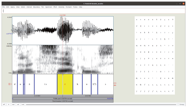 É possível usar símbolos fonéticos do IPA para realizar as anotações em um TextGrid. Tratase de uma opção interessante para utilização em trabalhos e publicações, com finalidade estética e interpretativa. Fora desse contexto de aplicação, é melhor usar caracteres comuns, para evitar problemas de codificação de caracteres (e possível perda de informações) e comprometimento do uso de scripts. Pode ser mostrada na janela de edição do TextGrid um painel com símbolos do IPA, para facilitar sua inserção aos rótulos, com um clique. Esse recurso pode ser habilitado e desabilitado em File → Preferences → Show IPA chart. A Figura 11 mostra a janela de visualização após a habilitação do painel de fontes fonéticas.