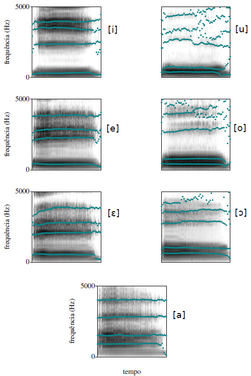 Na produção dos sons da fala, o trato vocal funciona como uma cavidade de ressonância, capaz de modificar as ondas sonoras produzidas pela fonação. As ressonâncias amplificam seletivamente o sinal acústico em regiões de frequência próximas às frequências de ressonância da cavidade, que, por sua vez, dependem da configuração articulatória do trato. Como consequência dessa amplificação seletiva surgem os formantes, que são ondulações no espectro dos sons da fala emitidos e que dependem diretamente das frequências de ressonância da cavidade. Formantes são eventos acústicos que podem ser sistematicamente associados à posição da língua durante a produção de uma vogal. Os formantes relevantes para a caracterização das vogais são os três primeiros (F1, F2 e F3), mas especialmente os dois primeiros estão relacionados à diferenciação das vogais em termos de altura e anterioridade. F1 está relacionado à altura da vogal: quanto mais alta a vogal, menor o valor de F1. F2 está relacionado à anterioridade/posterioridade da vogal: quanto mais anterior a vogal, maior o valor do F2. A Figura 12 mostra espectrogramas das sete vogais orais tensas do português, com traçado dos formantes, e permite a avaliação de como os dois primeiros formantes se relacionam à qualidade das vogais.