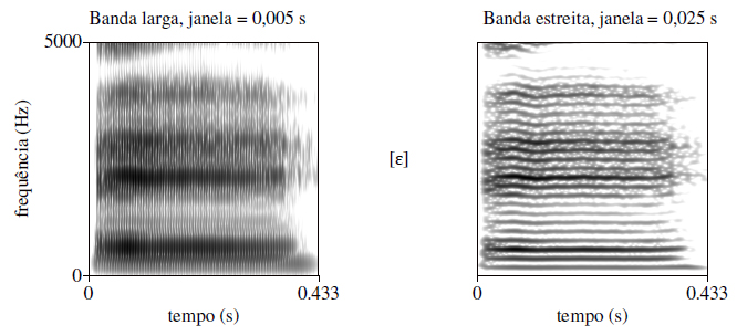 A Figura 13, à esquerda, mostra o espectrograma gerado com janela de 0,005 s, correspondente à configuração de banda larga. A resolução em frequência é baixa, de forma que as faixas horizontais correspondem aos formantes da vogal. À direita, é mostrado o espectrograma gerado com janela de 0,025 s, correspondente à configuração de banda estreita, para o mesmo trecho de áudio. A resolução em frequência é alta, de forma que as faixas horizontais correspondem aos harmônicos da vogal.