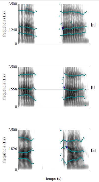 O valor de F2 e F3 na transição entre uma oclusiva e uma vogal adjacente pode ser usado para avaliação do ponto de articulação da oclusiva. A medição dos formantes é realizada tal como descrito na seção 5, para análise de vogais, com exceção do ponto de medição: neste caso, busca-se justamente o ponto de transição da vogal com a consoante (ao invés de uma porção estável, no meio da vogal, no caso da avaliação da qualidade vocálica). O valor de F2 e F3 na transição depende da qualidade da vogal, devendo-se comparar as medições realizadas em uma mesma vogal. De modo geral, consoantes bilabiais apresentam F2 mais baixo do que alveolares; alveolares, valor de F2 mais baixo do que velares. O valor de F3 também pode ser usado para caracterização do ponto, mas não será abordado aqui. A Figura 14 mostra espectrogramas de três consoantes oclusivas intervocálicas ([p], [t] e [k]), destacando com uma seta azul os pontos de medição de F2 na vogal seguinte e seus respectivos valores, que crescem acompanhando a posteriorização da oclusão. Os intervalos dos eixos horizontais foram omitidos por não serem relevantes para a medição em questão. Os formantes na transição com uma vogal também são afetados pelo ponto de articulação das fricativas, mas a avaliação espectral é mais frequentemente empregada na avaliação do ponto desse grupo de sons.