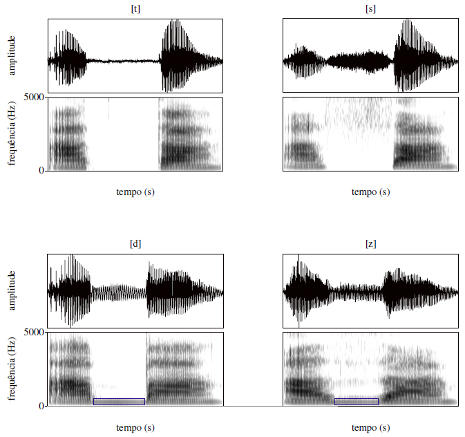 O vozeamento das consoantes oclusivas e fricativas pode ser avaliado acusticamente, na forma de onda, pelas oscilações periódicas aproximadamente senoidais, no trecho que corresponde ao fechamento. No espectrograma, o vozeamento pode ser identificado pela presença de uma faixa escura na região de frequência correspondente à frequência fundamental da voz. Esta faixa é chamada de barra de vozeamento. A Figura 15 mostra a forma de onda e o espectrograma de consoantes oclusivas e fricativas não vozeadas, acima, e vozeadas, abaixo, em contexto intervocálico. Um retângulo azul identifica a barra de vozeamento nas vozeadas, ausente nas não vozeadas.