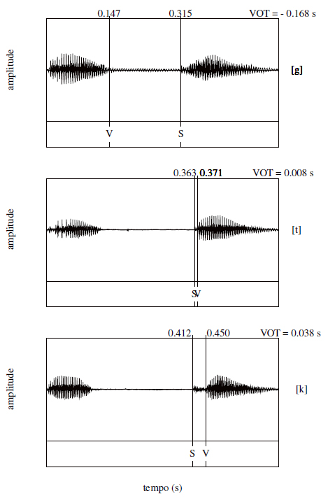 Nas oclusivas, a presença de aspiração após a soltura pode ser avaliada acusticamente por uma medida chamada VOT (voice onset time, ou tempo para início do vozeamento). Essa medida permite não apenas quantificar a aspiração, mas estabelecer uma oposição entre oclusivas vozeadas, oclusivas não vozeadas não aspiradas e oclusivas não vozeadas aspiradas. É especialmente útil em línguas que utilizam essa diferenciação acústica de forma contrastiva. O VOT é uma medida de duração realizada em oclusiva seguida de vogal, a partir de dois pontos de referência: o ponto de soltura (S) da oclusiva e o ponto em que se inicia o vozeamento (V) (que pode ser na própria consoante, no caso se vozeadas, ou na vogal, no caso de não vozeadas). O VOT é obtido pela operação VOT = V - S. Vozeadas apresentam VOT negativo, pois o vozeamento ocorre antes da soltura, ainda durante o fechamento. Não vozeadas que não são aspiradas apresentam VOT próximo de zero, podendo ser ligeiramente positivo. Aspiradas apresentam VOT positivo superior ao das não aspiradas, podendo ser da ordem de 50 a 120 ms (mas esse valor depende da língua). A Figura 16 mostra a medição de VOT para três oclusivas do português: [t], [g] e [k]. Os eixos horizontais não apresentam o mesmo intervalo. Seus valores foram omitidos por economia, mas os pontos temporais importantes foram assinalados. Ainda que no português a aspiração das oclusivas não tenha função contrastiva, observa-se que a velar não vozeada apresenta certo grau de aspiração, como é comum também em outras línguas.