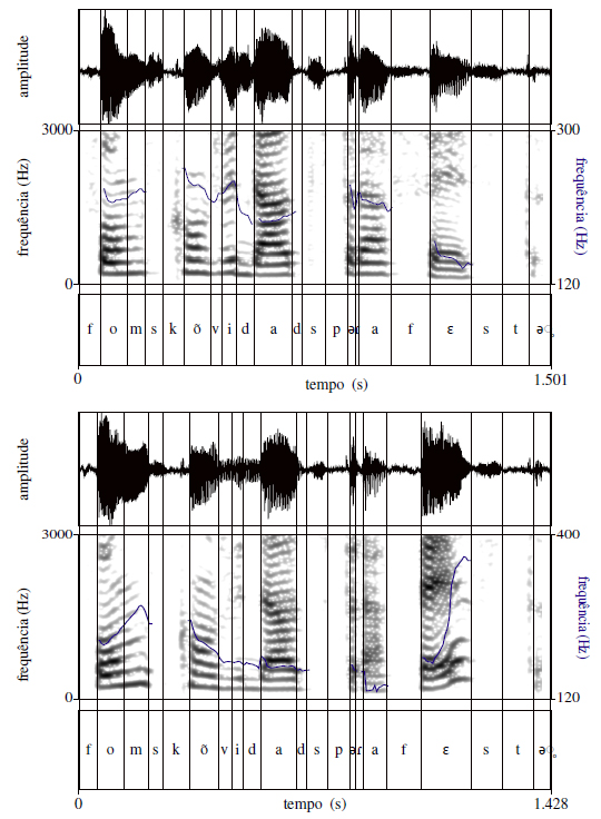 O traçado da variação da frequência fundamental ao longo de enunciados corresponde ao que se chama de curva entoacional ou curva melódica. Sua avaliação implica em monitorar os valores de F0 ao longo do tempo. O Praat apresenta o recurso de rastreamento de F0 (pitch tracking ), que pode ser utilizado para analisar a curva entoacional. Para habilitar o recurso, deve-se selecionar Pitch → Show Pitch. Após essa seleção, aparecerá uma linha em azul mostrando a variação da curva de F0 ao longo da gravação, por padrão, sobreposta ao espectrograma. Observe que essa curva em azul corresponde a um novo eixo vertical de frequência, que estará localizado à direita e tem extensão diferente do eixo vertical de frequências da esquerda, que se refere ao espectrograma. A curva de F0 gerada pelo programa é um gráfico independente do espectrograma (experimente suprimir o espectrograma, com Spectrum → Show Spectrum (desabilitado)). Pode ser transformada em um objeto independente, que aparecerá na janela de objetos e pode ser submetido a medições e manipulação, ao se selecionar Pitch → Extract visible pitch contour. Opções relevantes para o objeto de tipo pitch serão apresentadas no menu dinâmico da janela de objetos. A Figura 17 apresenta dois exemplos de enunciados, contendo a expressão “Fomos convidados para a festa”, em uma declaração (acima) e em uma afirmação (abaixo).