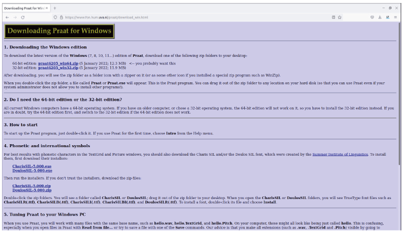 Na nova página, é apresentada a versão mais atual do programa, junto de materiais de apoio para a instalação e utilização do Praat (tais como instruções de instalação, tutoriais para novos usuários, pacotes de caracteres do IPA e versões do Praat compatíveis com versões antigas do sistema operacional), como se pode observar na Figura 2, que ilustra as opções de download para Windows da página do Praat.