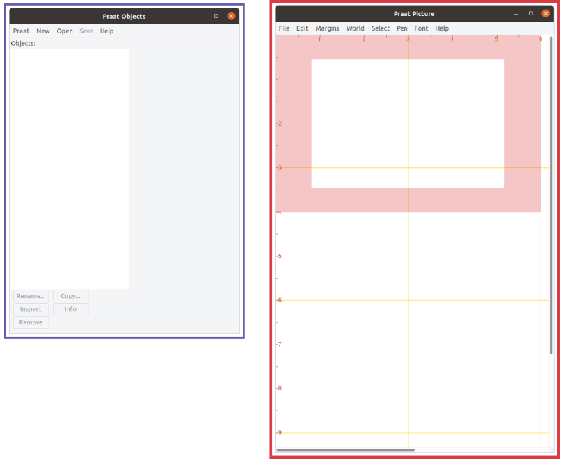 Após a inicialização do programa, duas janelas são abertas, a janela de objetos e a janela de imagens.A Figura 3 mostra a janela de objetos, indicada por um retângulo azul, e a janela de figuras, indicada por um retângulo vermelho. A operação do Praat se concentra na utilização da janela de objetos, já que a partir dela é possível manipular, modificar, editar, anotar e analisar um arquivo de som e os diferentes tipos de objetos que podem ser gerados pelo programa. A janela de imagens tem uso mais específico: é usada para gerar figuras, frequentemente a partir de representações gráficas da fala. Além dessas duas janelas iniciais, outras janelas são abertas, à medida que as funções do programa são acionadas.