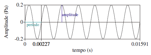 O intervalo de tempo em que ocorre um evento acústico é a sua duração, expressa em segundo (s) por padrão. Uma oscilação que se repete sistematicamente, com ciclos iguais, é periódica. A duração de um ciclo é chamada de período e sua taxa de repetição em um segundo é definida como sua frequência. Período (T) e frequência (F) se relacionam matematicamente por F = 1/T . Diferentes frequências estão associadas a diferentes oscilações presentes nas ondas sonoras. A frequência é expressa em hertz (Hz), que corresponde a ciclos por segundo. A Figura 4 mostra a amplitude e o período de um tom simples, que é uma onda sonora composta por uma única frequência.