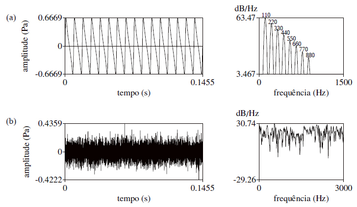 As ondas da fala e a maioria dos sons cotidianos são caracterizadas por oscilações de amplitude em múltiplas frequências. As frequências da voz, assim como de certos instrumentos musicais e outros dispositivos, apresentam valores seguindo um padrão bem definido: formam uma série harmônica. A frequência mais baixa é chamada frequência fundamental, ou F0, que no caso da voz é determinada pela taxa de vibração das pregas vocais. Além de F0, estão presentes uma sequência de frequências com valores múltiplos inteiros da fundamental, chamados harmônicos (H1, H2, etc., sendo H1 a própria frequência fundamental). A Figura 5 mostra dois exemplos: uma onda sonora periódica harmônica, com destaque para sua frequência fundamental e harmônicos, e uma onda sonora aperiódica, em que não há ciclos de repetição.