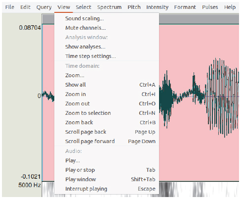 Na parte superior, há oito menus principais: file, edit, query, view, select, spectrum, pitch, intensity, formant, pulse. Ao clicar sobre cada um desses itens, abre-se uma listagem de comandos, ao lado dos quais podem estar especificados atalhos para acionamento pelo teclado.