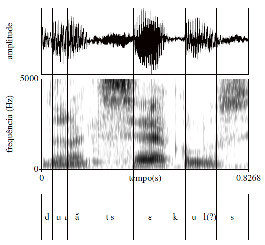 A análise fonética, assim como a fonológica, se baseia no princípio de que é possível decompor um enunciado falado em unidades discretas, como consoantes e vogais. Ressalte-se, contudo, que a fala é produzida pelas estruturas do trato vocal, que se movem continuamente e gradualmente ao longo do tempo. É notável que os diferentes sons que compõem sílabas, palavras e sentenças se sucedem sem que haja necessariamente uma interrupção ou descontinuidade entre eles. Ou, quando há descontinuidades, nem sempre correspondem ao que concebemos como as fronteiras entre os segmentos. Além disso, os sons sucessivos interferem uns nos outros e suas diferentes combinações geram diferentes padrões de transição, coarticulação e alterações sonoras. Observe na Figura 9, que corresponde à produção da sequência de palavras “durante séculos”.