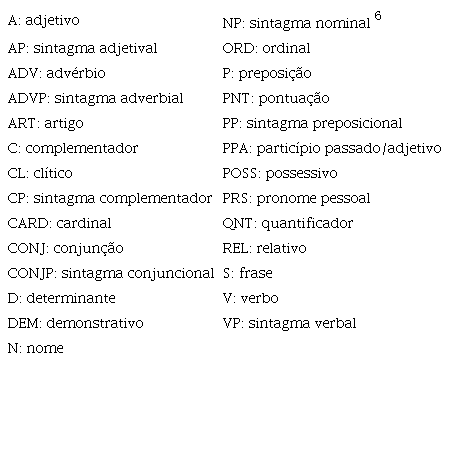 Como apresentado no final da seção 2, o LX-Parser trabalha com uma tipologia específica de etiquetas e, portanto, de categorias linguísticas.