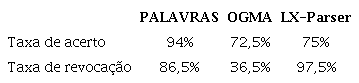 Como se pode ver, o Palavras foi o que teve a melhor taxa de acerto, mas o LX-Parser foi o que apresentou a melhor taxa de revocação. No que se refere aos problemas encontrados em relação a cada uma das ferramentas, Silva (2014) esclarece que: