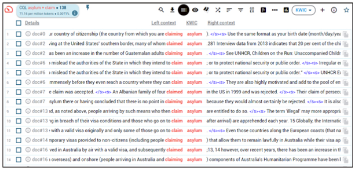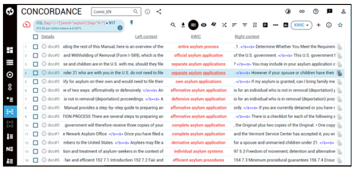 Regular expression search: enables the search for complex linguistic patterns by using special symbols11. It is possible to look for words finishing in *ing, for example, or phrases fitting in the pattern ADJ + NP. In Sketch Engine, regular expressions can be used in concordance searches to fit in word-level patterns, or as a part of the Corpus Query Language (CQL) to investigate complex patterns. In Figure 2, we are searching for phrases fitting in the ADJ + asylum + NN pattern. The CQL query can be seen in the blue box at top, on the left side of the screen.