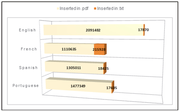 Figure 4 shows that approximately 4.5% of COMMIRE texts (the equivalent to 270,95 tokens) were, in fact, converted into .txt and manually edited to correct OCR conversion problems. French has the largest number of treated texts because it was the language we first applied manual treatment of files. All the files in the parallel subcorpus are already in UTF-8 coded, plain text format.