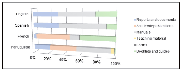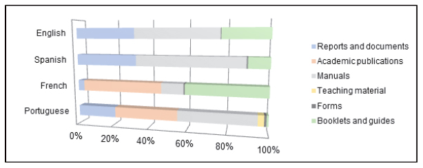 At first, we considered booklets and guides as different materials, but a detailed analysis of the content revealed that they are very similar materials, both focusing on informing about something on a clear and simple way, often using several visual resources. Thus, even though the collected texts are configured differently, depending on the text type, they all have an informative purpose, except for the forms. Table 5 presents the number of tokens and files (in parenthesis) collected in each of the aforementioned text types in the total corpus. Figure 5 shows the percentage of tokens by text type in each language of the corpus.