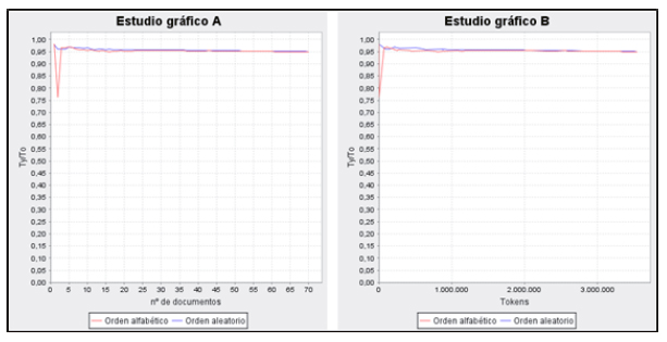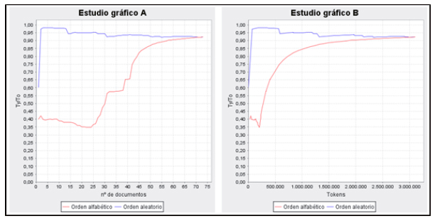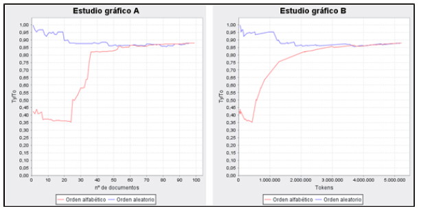 As for attesting whether a corpus is representative of a language or one of its subsets, there is no method so far to determine in advance how many samples of language should be collected to achieve representativeness. Nevertheless, it is possible to adopt a corpus-driven approach to verify whether the corpus is large enough after the collection phase: the ReCor program (SEGHIRI, 2014). The software generates graphs containing two lines, a red line (representing alphabetically ordered files), and a blue line (representing randomly ordered files) (id., ibid.). Calculations are based on the Zipf Law and the type/token ratio, indicating that a corpus reaches representativeness when new tokens are not being included, from a statistic standpoint, in amounts significant enough to alter the curves (ibid.). Therefore, a corpus can be considered to be representative when the curves approximate to 0.5 in the type/token (Ty/To) axis (ibid.).