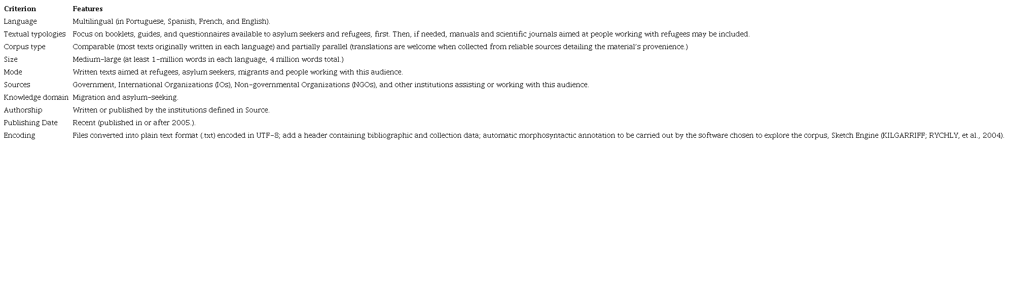 Before starting collecting texts for a corpus, it is essential to plan its intended content. This plan will guide the process of selecting and capturing its texts, as emphasized by Bowker and Pearson (2002) and Teixeira (2008). Based on the criteria previously described, we planned our corpus to reflect the features summarized in Table 2.