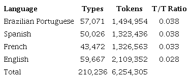 English is currently seen as a “lingua franca” (HOFFMAN, 2000), and that accounts for the fact that its presence on the Internet is far more abundant than other languages, as there is much more content being produced and publicized in this language. That made it easier for us collect data in this language; as a result, this subcorpus has the largest number of types and tokens. In our search, we noticed a significantly higher occurrence of guides and manuals in English, compared to other text types and to other languages.
