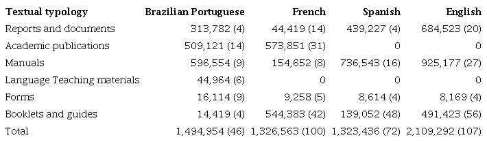 It was much easier, as previously mentioned, to find booklets and guides in Spanish, French, and English because we checked several countries, whereas for Brazilian Portuguese, searching was restricted to Brazil only. Nevertheless, we can argue that the main criterion we used for text selection was “opportunistic”, in the sense that availability and easiness of finding them on the Internet were key factors, as we were hoping to simulate the experience of the majority of people looking for information. Producing a glossary that will be effectively used by those who seek these materials on the Internet means providing translators, interpreters and migrants with the terminology occurring in the materials they will consult, use, and/or translate on a daily basis. However, we ended up having to balance the corpus, especially in French, since the booklets we found had fewer words, leading us to add other text types to the French subcorpus so as to reach a number of tokens similar to the other corpora.