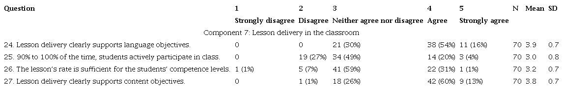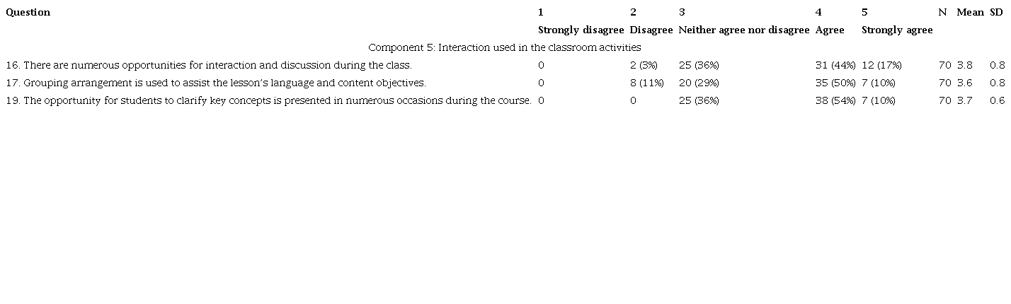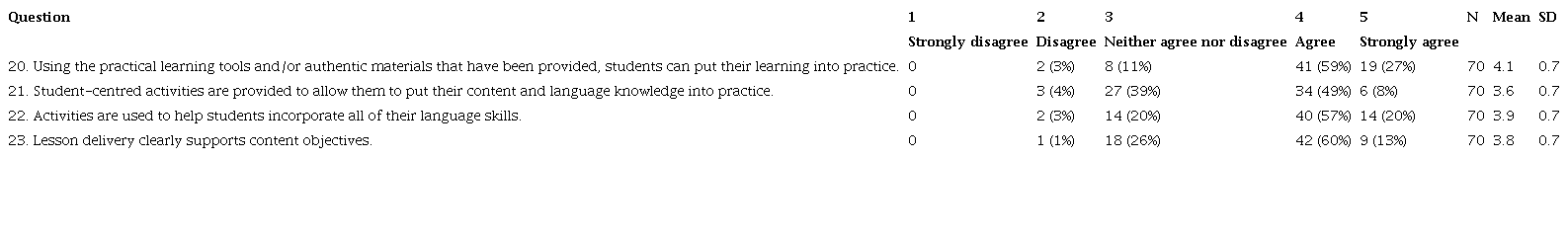 Using QQs 7-9 (see Table 5); the author investigated students’ building backgrounds. The results for QQs 7-9 show that the majority of students (N = 70, 67.33 %) agreed and that concepts were clearly connected to students’ background experience. Some important activities were used to combine lesson concepts with language practice opportunities (i.e., speaking, reading, and writing) and key vocabulary.