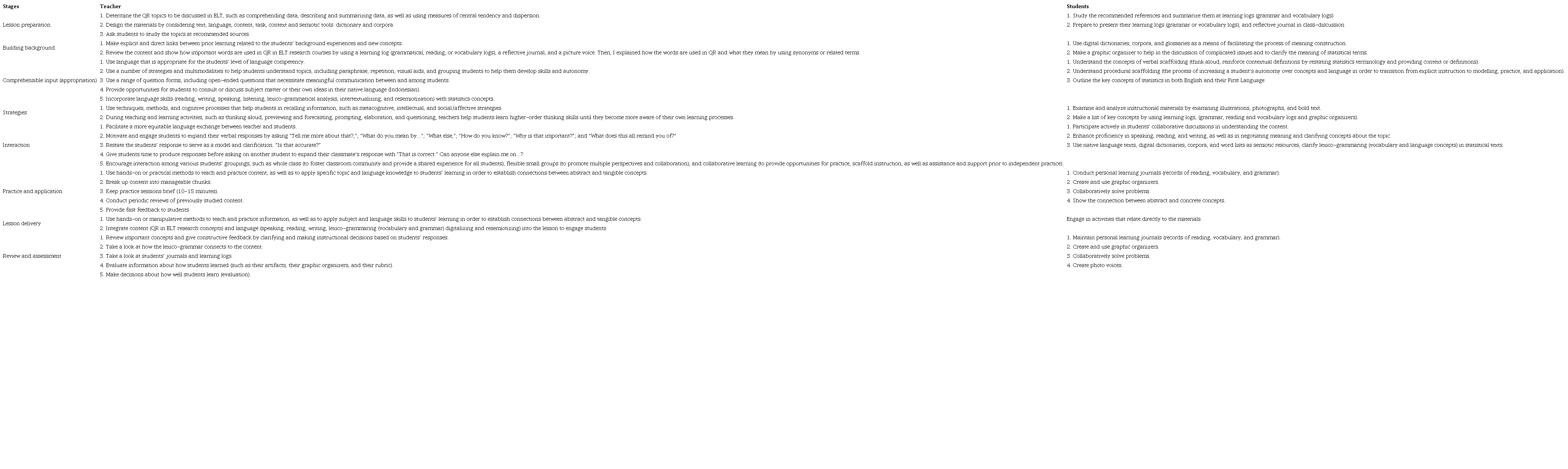 The SIOP model assisted me in autonomously understanding unknown words in QR in ELT research text, in knowing and understanding their meanings, and in actively understanding the texts through analysis of grammatical forms and grammatical features.” ”With the SIOP model, I could more actively and independently find the meanings of unfamiliar words in the QR in ELT research text by reading them again and again... If I didn’t have the SIOP model, I might have just found out what the words meant without trying to understand them fully, and I might have quickly forgotten them.”