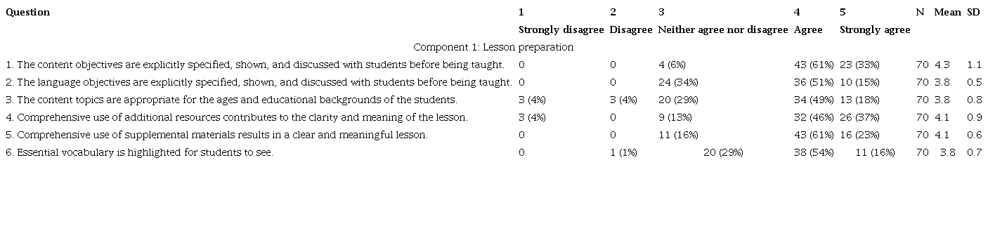 The SIOP principles employed in the course design are as follows: The model includes elements of effective teaching for all students (e.g., cooperative learning, reading comprehension strategies, differentiated instruction, and the integration of the four language skills: listening, speaking, reading, and writing). Students who took the QR in the ELT course learned about basic math and statistics, how to measure relationships in ELT research, and how to use inferential statistics in research, among other things (Table 1).