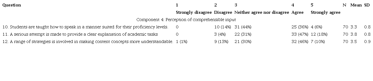 Using QQs 10-12 (see Table 6), the authors investigated students’ perceptions of comprehensible input. As shown in Table 6, the results for QQs 10-12 reveal that the majority of students (N = 70, 70.67 %) agreed that they understood verbal scaffolding, e.g., reinforcing contextual definitions by stating QR in ELT terms. They were also able to list the key QR in ELT concepts both in English and in the Indonesian language. Through appropriation, they could also be on their own when it comes to understanding content and language.