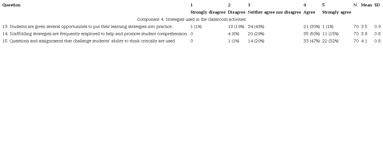Through QQs 13-15, we investigated students’ strategies used in the classroom activities. The results for QQs 13-15 presented in Table 7 reveal that the majority of students (N = 70, 76 %) agreed that they could preview and analyze the learning materials, e.g., descriptive statistics and inferential statistics, through illustrations and pictures. They were also able to list the key concepts by employing grammar, reading, and vocabulary logs and graphic organizers as well.