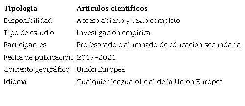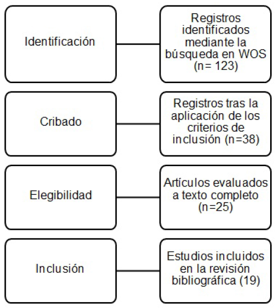 Para realizar la búsqueda bibliográfica, se ha utilizado como base de datos Web of Science (en adelante WOS), debido su potencial para dar cobertura a la literatura científica de ámbito internacional. Con relación a los términos de búsqueda, se han empleado “matemáticas”, “tecnología”, “aprendizaje” y “educación secundaria”, tanto en inglés como en español. La búsqueda devolvió un total de 123 resultados, los cuales han sido filtrados en base a los criterios de inclusión que se ofrecen a continuación: