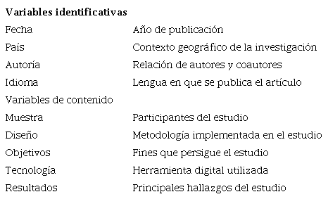 Con los 19 documentos seleccionados, se realiza un análisis de contenido que se centrará en las siguientes variables de estudio: