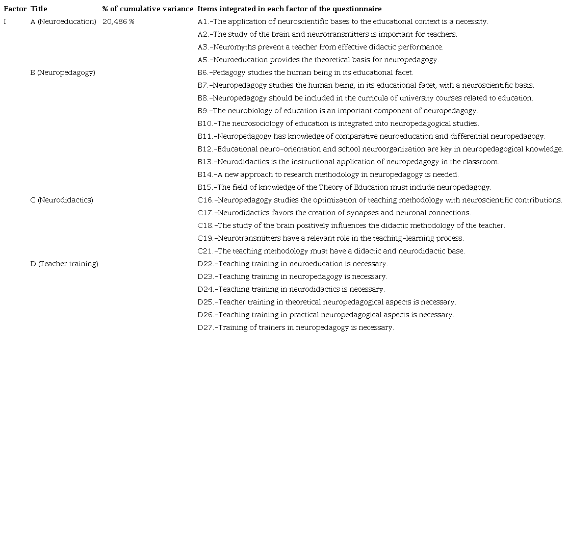 The best represented items are: D26.-Teacher training in practical neuropedagogical aspects is necessary (.943); D23.-Teacher training in neuropedagogy is necessary (.940) and D25.-Teacher training in theoretical neuropedagogical aspects is necessary (.930). The worst rated item is A5.-Neuroeducation provides the theoretical basis for neuropedagogy (.492).
