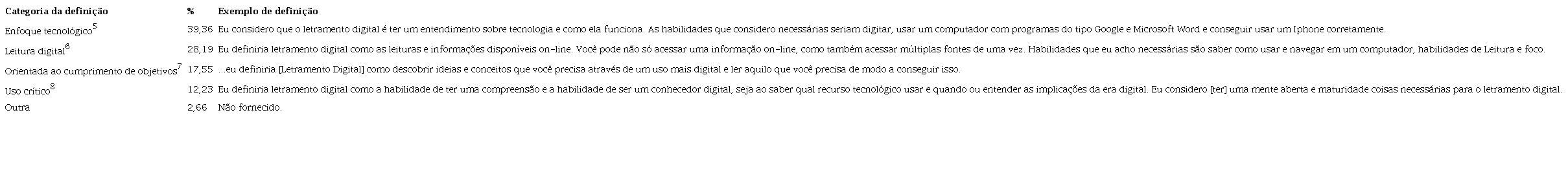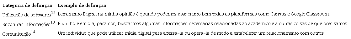 A frequência de respostas em cada categoria nesta etapa não foi divulgada, uma vez que a pesquisa prosseguia com uma etapa quantitativa, elencando competências pré-definidas relacionadas ao Letramento Digital; essas, sim, com frequência disponível e analisadas em maior detalhe. A título de ilustração, nessa etapa foram elencadas sete dimensões de Letramento Digital, da maior à menor, seguidas da média ponderada: comunicação (3,95), habilidades de segurança on-line (3,87), encontrar informação (3,79), pensamento crítico (3,77), habilidades funcionais (3,75), colaboração e criatividade (3,43) e dimensão cultural (3,40).