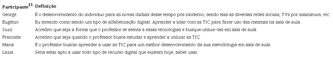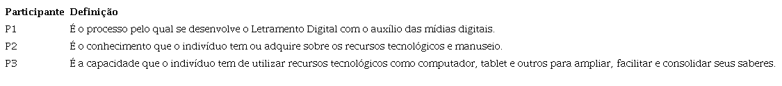 No estudo de Santos e Lacerda (2017), investigou-se o grau de Letramento Digital de 3 (três) docentes de língua portuguesa, já em exercício, em três diferentes escolas de ensino fundamental de Teresina, no Piauí. Uma das perguntas do instrumento utilizado, um roteiro de entrevista estruturada, consistia em responder “o que é Letramento Digital?” (SANTOS; LACERDA, 2017, p. 85). As respostas fornecidas pelos participantes encontram-se na Tabela 3: