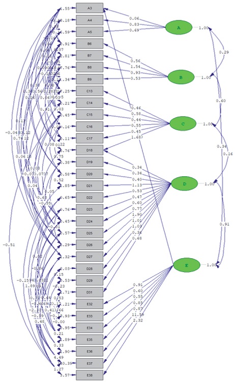 Phase IV.-Evaluation of the fit. Application of indices and goodness-of-fit criteria. In this stage we use goodness-of-fit indexes and criteria to relate the validation evidence with the dimensional structure of the instrument being evaluated, (consists of evaluating the goodness-of-fit between the matrix derived from the data and the matrix reproduced by the model: Difference X2/df (1871.12/374), it consist a good indicator if the result ranges between one and three or, more loosely, if the result of the difference is ≤ 5 (CARMINES; MCIVER, 1981; JÖRESKOG, 1970), the value obtained is 5.00, so the result is good. CFI, compares the improvement in the fit of the model in question with a null model to evaluate the degree of loss of fit when switching from the proposed model to the null model (HU; BENTLER, 1999). The value to accept the proposed model, its value should be ≥ .95. To accept the value that results is .96., among the indices based on covariances, the root mean square error of approximation (RMSEA) was chosen. In this case the model would present an acceptable fit if the value was <.07 (STEIGER, 2007), the value we calculated in our model is .068 which is acceptable. NNFI reflects the proportion of total information explained by a model; because this index is not standardized, its values can adopt values outside the range 0 and 1. A value of .97 seems to be more reasonable as an indication of good model fit. A value we obtained is .94 (SCHERMELLEH; MOOSBRUGGER; MULLER, 2003, p. 41). As can be seen, the criteria for all goodness-of-fit indices are met, so the model can be considered confirmed.