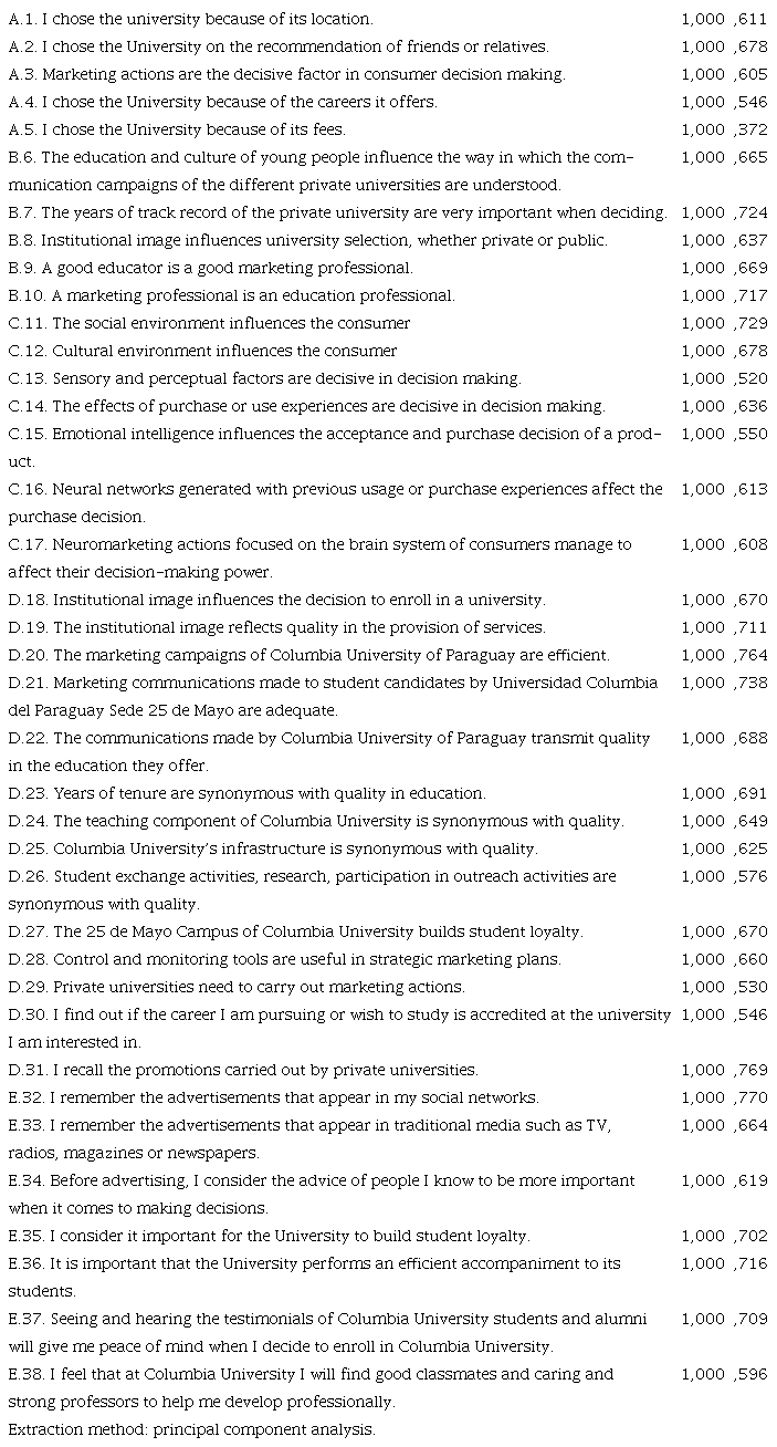 The best represented items are: E32 (.770)-I remember the advertisements that appear in my social networks. D31. (.769)-I remember promotions carried out by private universities. D20. (.764)-The marketing campaigns of Columbia University of Paraguay are efficient. C11. (.729)-The social environment influences the consumer. B7. (.724)-The years of experience of the private university are very important when deciding.