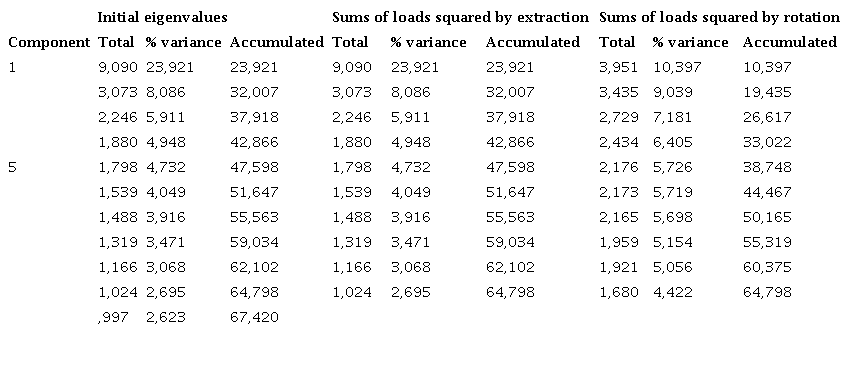 2 Factor extraction: once it has been decided that factor analysis can continued good results, we provide to the extraction of the factors. In a good extraction, these values should be high (the closer to one the better) in all variables. The resulting table of communalities shows that the factors have a value greater than .372, so it is not necessary to eliminate any item from the factor analysis (Table 1).