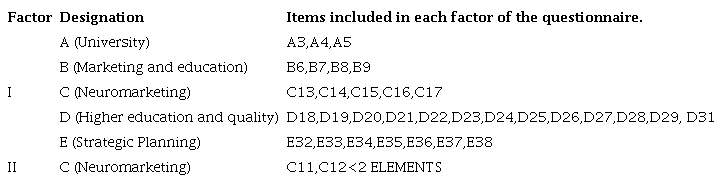 C.-Neuromarketing: D.-Higher education and quality; and E.-Strategic planning. The objective of this research was to analyze the relationship between marketing, neuromarketing and strategic planning in the university environment. For the validation of the data collection instrument, we resorted to content validation, which was satisfactory, and construct validation, through exploratory factor analysis. The result of this analysis on the one hand confirms our dimensions, and on the other hand reduces the scale to 32 items, obtaining a reliability according to Cronbach’s alpha of excellent (. 907), so it is validated in its construct.