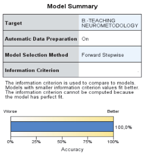 Finally, an automatic linear model has been carried out, with the intention of being able to establish how the variable ”neuropedagogy” will behave according to the interaction of the rest of the variables. With this, ”neuropedagogy” has been taken as the objective and the variable ”degree of training” as the analysis weight. The resulting model has an accuracy of 100% (Figure 1), showing the weight, from highest to lowest, of the variables that will influence, thus: The most influential is: B6.-Teaching neuromethodology is the set of methods, strategies, techniques, instruments and resources, based on neurodidactics, that allow the development of teaching practice.