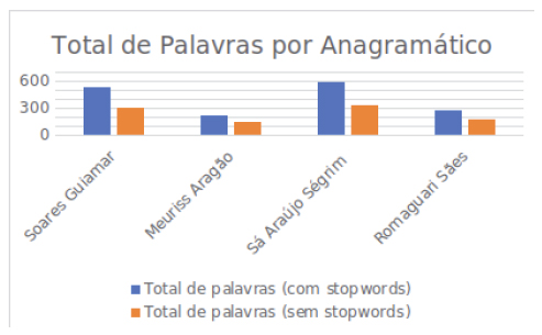 Após esses comandos, foi contabilizado o número total de palavras para cada anagramático. Em seguida, foram retiradas as chamadas stopwords, isto é, palavras funcionais e pouco informativas que compõem boa parte dos enunciados das línguas humanas. Para isso, foi utilizada a lista padrão de stopwords para o português da biblioteca Natural Language Toolkit, NLTK (BIRD; KLEIN; LOPER, 2009).