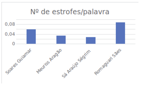 Embora Sá Araújo Ségrim seja o anagramático com o maior número de palavras - e, portanto, o escritor da obra mais longa dentre os quatro - a avaliação do número de estrofes demonstrou que, após Soares Guiamar, com 31 estrofes, Romaguari Sães foi o poeta que mais se destacou, tendo escrito 24 estrofes com apenas 272 palavras, conforme a Figura 2, que mostra a relação entre o número de estrofes e o número de palavras, sugerindo uma marca estilística única dentre os anagramáticos.