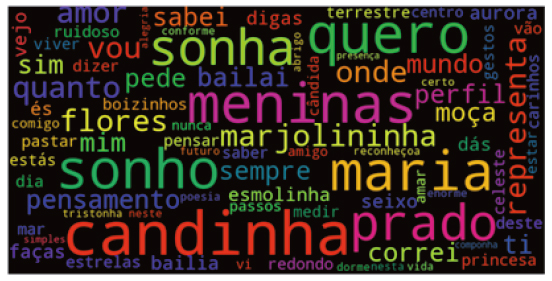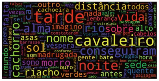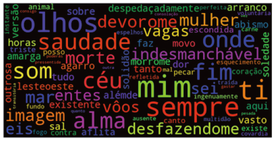 Como recurso a ser utilizado em análises qualitativas dos assuntos recorrentes nos poemas dos anagramáticos, propusemos a criação de nuvens de palavras (wordclouds), gráficos que possuem o objetivo de representar visualmente, com o auxílio de diferentes tamanhos de fontes e cores, a frequência de palavras em determinado conjunto de textos (JAFAR; BABB; DANA, 2012). Para cada um dos autores, foi criada uma nuvem de palavras, procurando sintetizar os temas recorrentes em seus estilos poéticos (Figura 3, Figura 4, Figura 5, Figura 6). No Apêndice A, há a lista das 10 palavras mais frequentes para cada anagramático.