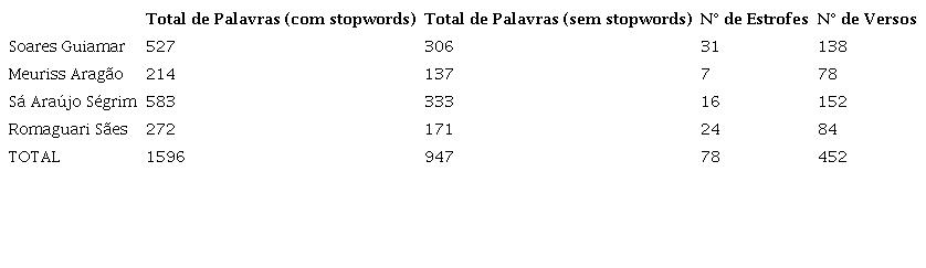 Como métricas utilizadas, foram calculados os números brutos de palavras por anagramáticos, número de estrofes e de versos. Para o número de estrofes, em virtude da diferença de tamanho e do número e de textos para cada autor, optamos por fazer uma normalização em relação ao número de palavras. Nesse sentido, evitando vieses, os números de estrofes foram calculados em relação ao número de palavras para cada autor-anagrama, como é comum em trabalhos de Linguística de Corpus.