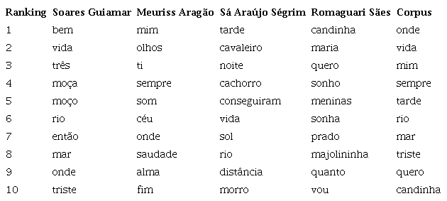 Como já apresentamos na seção de resultados, Romaguari conta com uma construção estrófica única em relação aos seus pares, produzindo um grande número de estrofes pequenas, em geral, metrificadas. Dentre as 10 palavras mais frequentes, citamos “prado”, também indicada por Rossi (2007) como um termo que aproxima sua estética da poesia medieval.