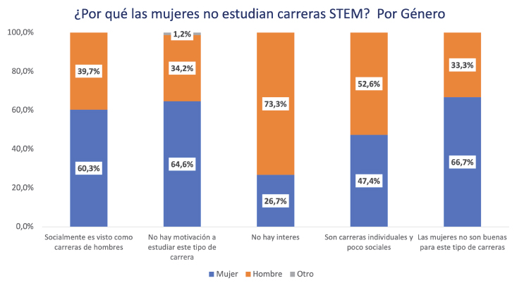 Al realizar un análisis por sexo a esta pregunta, del universo que dio como respuesta que estas carreras son vistas como carreras de hombres, el 60,3 % corresponde a mujeres y solo el 39,7 % a hombres, algo similar ocurre con las respuestas de que no existen motivaciones para que mujeres estudien carreras STEM y la respuesta que las mujeres no son buenas para estudiar este tipo de carrera ya que del universo que responde el 64,6 % y 66,7 % respectivamente son mujeres, en la última respuesta se puede apreciar el menor autoconcepto de las encuestadas con respecto a su capacidad en las áreas de STEM. Por su parte, el 73,3 % de los hombres cree que los bajos números de mujeres en este tipo de carreras se debe al poco interés de las mujeres en estas áreas.