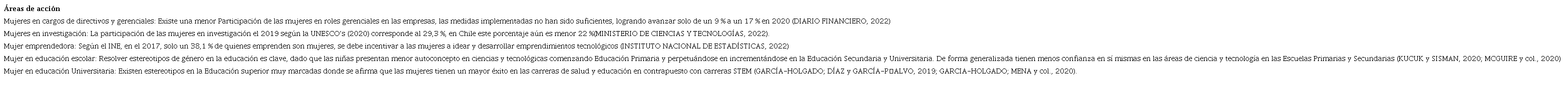 En el área tecnológica mediante una encuesta a 140 empresas chilenas (MUJERES, 2021), solo el 81,4 % afirma contar con menos del 40 % de mujeres en el área. Además, ellas se encuentran en cargos de formación.