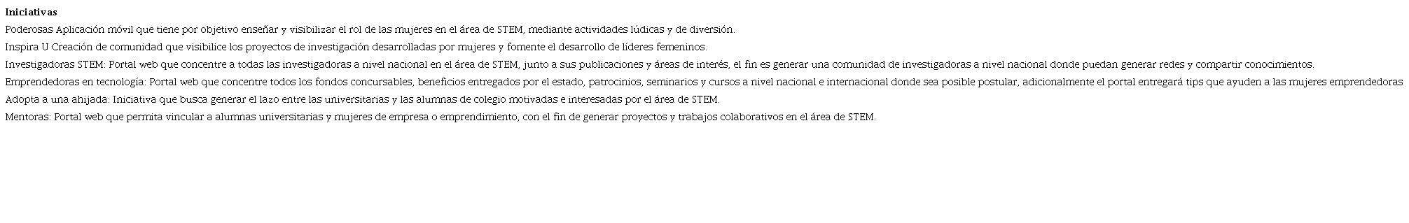 Fue posible obtener la visión de la ciudadanía respecto a las principales dificultades y dolores que enfrentan las mujeres desde la infancia hasta la vida adulta en el área de STEM, de forma adicional se logro identificar cinco áreas de acción claras sobre las que hay que centrar los esfuerzos para mitigar la brecha de género en el área STEM. Treinta propuestas llegan a término de las cuales dieciocho impactan de forma directa a una de las cinco áreas de acción de definidas, logrando mitigar las brechas en esta área.