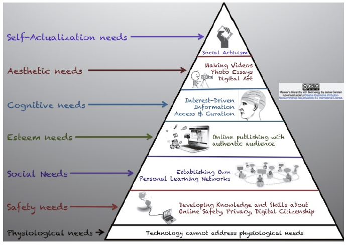 El modelo de Maslow o Jerarquía de necesidades de Maslow fue explicado por Gerstein (2014) desde la integración de la tecnología para satisfacer las necesidades del alumnado. Gerstein indica que trasladar este modelo a la educación es una forma ideal de evaluar planes curriculares, cursos y programas educativos. Conocer las necesidades del alumnado y preguntarse si estas necesidades se satisfacen en la escuela o en el aula, permite al profesorado integrar las TIC con previsión y con la intención de alcanzar objetivos específicos al mismo tiempo que orientan y potencian el aprendizaje del alumnado. En la Figura 2 se muestra alguna de las estrategias de integración de tecnología que se puede utilizar para abordar los diferentes niveles de las necesidades de Maslow.