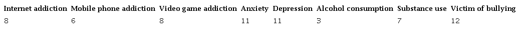 After the application of the set of instruments, 8 participants were diagnosed with addiction or risk of addiction in terms of internet use, 6 participants with addiction or risk of addiction in terms of mobile phone use, and 8 participants with addiction or risk of addiction in relation to video games. In addition, 11 of the participants presented anxiety problems, another 11 presented symptoms associated with depression, 3 presented problems with alcohol consumption and 7 with substance use, while 12 of the participants were victims of bullying. These data are summarised in Table 2.