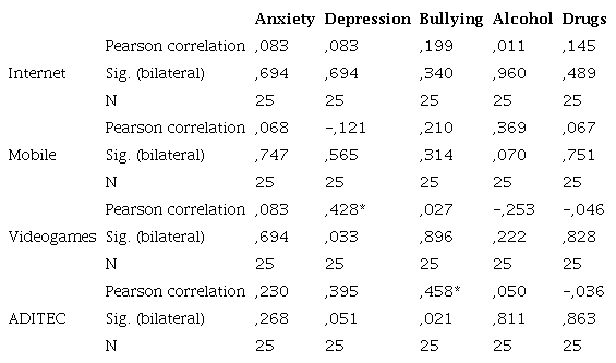 In terms of addiction to technologies, a total of 15 subjects were detected with addiction or risk of addiction to one or more technologies (mobile phone, internet and/or video games). This represents 60% of the sample, a fairly high percentage. A study carried out by Cambra et al. (2020) on the use of mobile phones indicates that the participants in this study stated that they were constantly connected to the Internet via their mobile phones, so the percentage obtained in this study is in line with this statement.